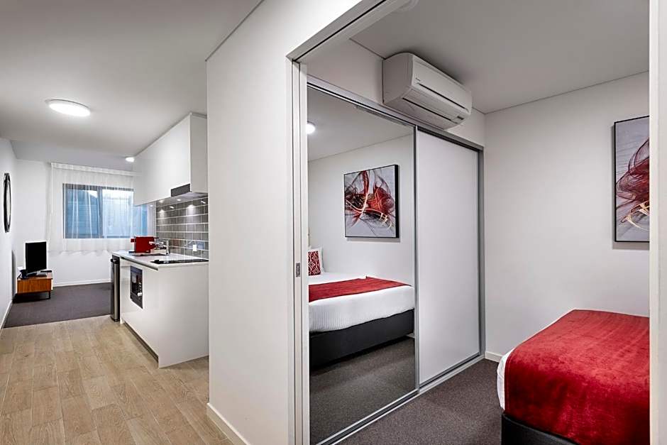 Located on level 1, this room includes a kitchenette with a cooktop, microwave and bar fridge, and a bathroom. A 43-inch TV in the lounge area and a 32-inch TV in the bedroom. There is access to the communal laundry and fitness center. Complimentary WiFi and in-room movies are also offered.